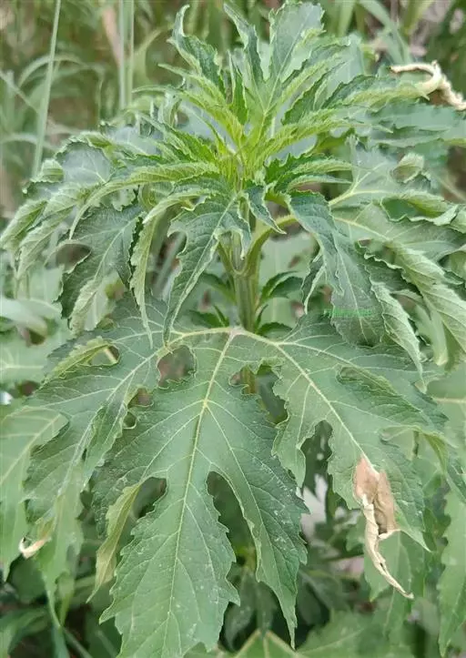 三裂叶豚草是直根系植物,其植株较豚草高大粗壮,株高可达250-300厘米,茎粗可达2.5-3.0厘米,最小的植株高30-40厘米,茎粗5-6毫米。茎绿色,有纵条棱,密生瘤基直立硬毛,后期毛脱落残留下瘤基。分枝大部分从植株的中上部分枝,发育好的有四级分枝,形成小乔木状的巨大植株,也有少量植株自基部长出数条粗壮的分枝,形成灌木丛状。