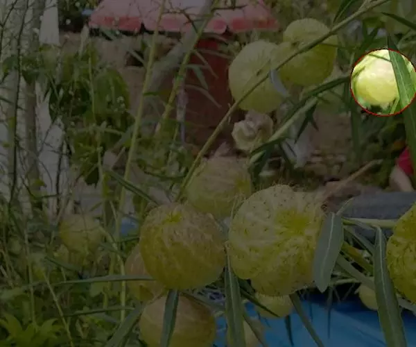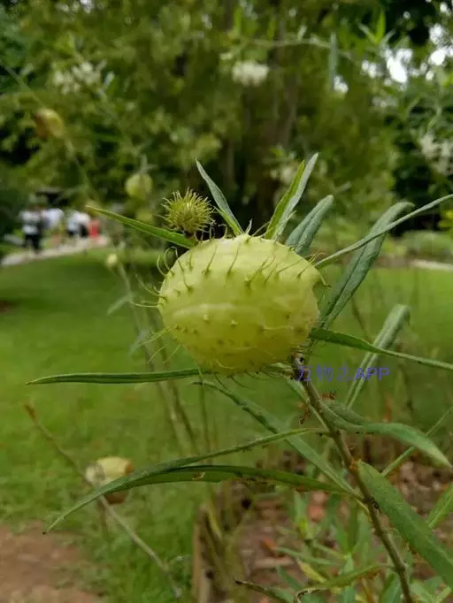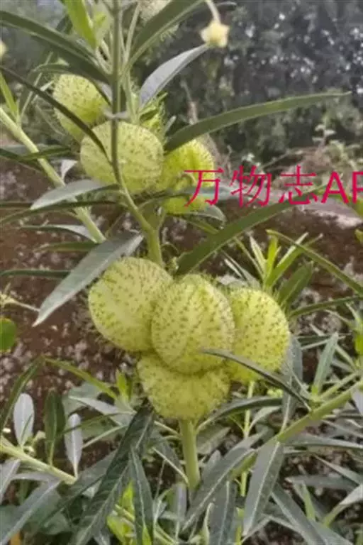 气球果(Asclepias fruticosa L.),萝摩科(Asclepiadaceae)亚灌木,高达1.8m,是一种奇特而有趣的观赏植物,在秋冬季节花、果并存,观赏期极长。原产热带非洲,华南植物园已有引种栽培。在我国北方常作盆栽,布置书房、客厅、阳台等处;在南方还可露地栽培点缀庭院、园林。