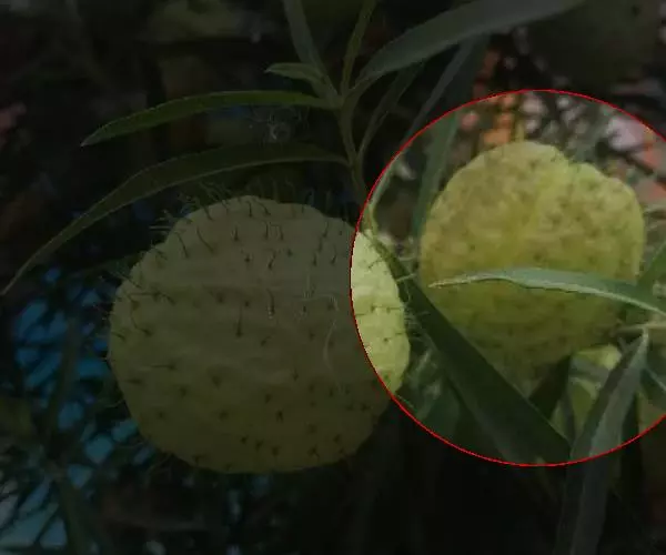 气球果,为萝藦科钉头果属常绿灌木,植株直立生长,多分枝,高2m~3m,茎具短绒毛,体内有白色乳汁状浆液;叶对生,叶片线形或线状披针形,较尖,形似柳树叶,表面光滑无毛,有时叶缘稍向外卷,叶色浓绿,背面稍淡。垂悬的伞形花序顶生或腋生,每个花序有五星状小花十余朵,花白色至淡黄色,花瓣长椭圆状卵形,花期极长,可从秋开到初春。果实黄绿色,卵圆形或椭圆形,顶端渐尖成喙,表皮有粗毛,仿佛用钉子锤入,又像河豚或充气的小气球,非常奇特。果内除种子外,中空无果肉,用手轻轻一捏即扁,似有空气溢出,稍后又复圆,很像气球。果实成熟后能自行爆裂,种子上部附生银白色绒毛,形似降落伞,风吹即飘飞到各处播种,故又名风船唐棉 。