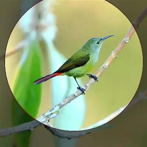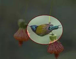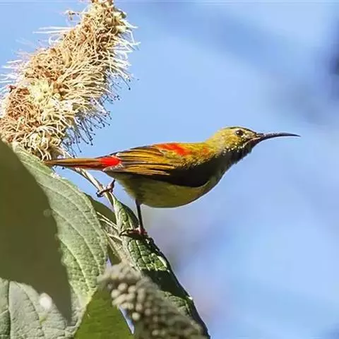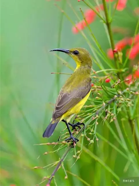 叉尾太阳鸟,雀形目太阳鸟科太阳鸟属留鸟;为小型鸟类,雄鸟头顶辉蓝绿色,上体橄榄绿色,腰明黄色,…