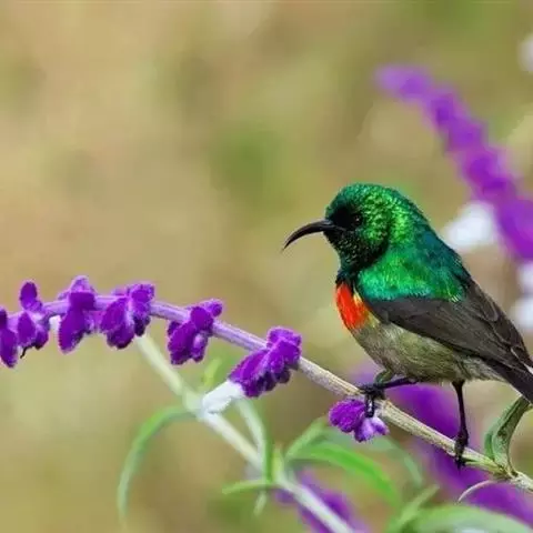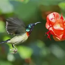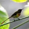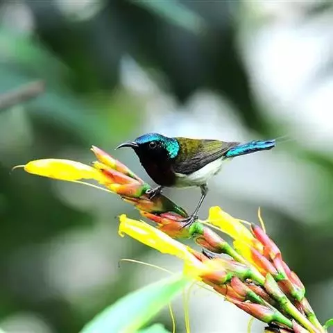 黑胸太阳鸟:小型鸟类,体长9-15厘米。嘴细长而向下曲。雄鸟中央尾羽特长,尾呈楔形,…