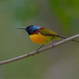 黄腰太阳鸟共有16个亚种,小型鸟类,体长10-15厘米。嘴细长而向下弯曲,雄鸟额和头顶前部金属绿色,…