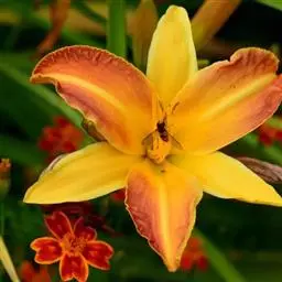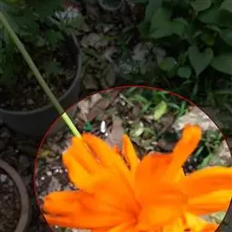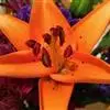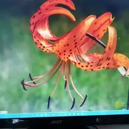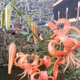 花单生或2~7朵排列成总状花序;苞片叶状,披针形,长4.5~5.5cm,宽0.8~1.5cm;花梗长2~8.5cm;花橙黄色或橙红色,有紫红色斑点;花被片长椭圆形,长4.8~5.2cm,宽1.2~1.4cm,蜜腺两边无乳头状突起;花丝长3cm,无毛,花药橙黄色;子房圆柱形,长8~12mm,宽3~4mm;花柱长为子房的2倍,柱头膨大,常3裂。