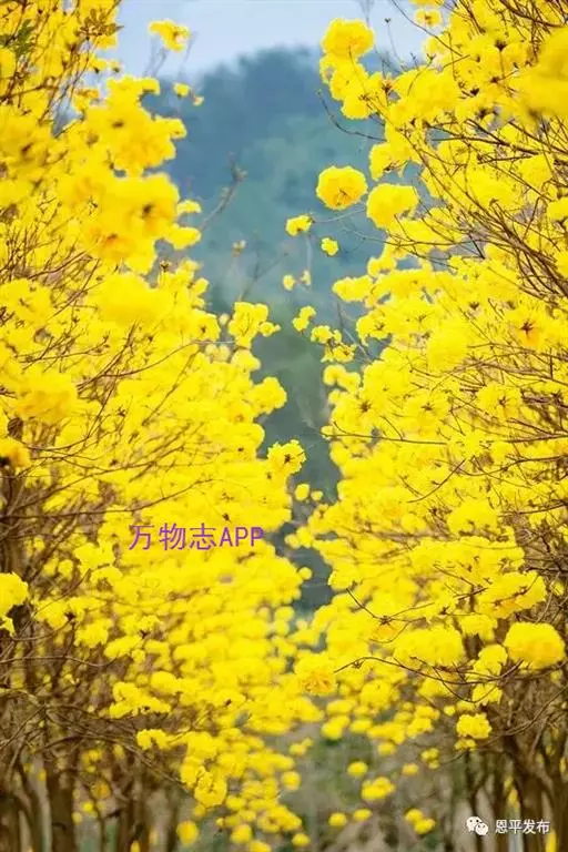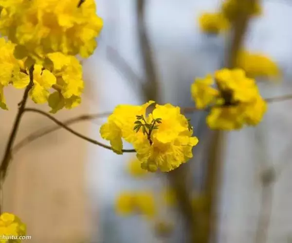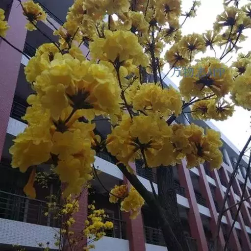 黄金风铃木(学名:Tabebuia chrysantha(Jacq. )Nichols),别称:黄花风铃木、黄丝风铃木、金花风铃木、伊蓓树、毛风铃、巴西风铃木。原产墨西哥、中美洲、南美洲,是巴西的国花。每年3、4月开花,花冠漏斗形、五裂,似风铃状,花缘皱曲,花色金黄。开花时只见花而不见叶,花期仅十余天。蓇葖果,开裂时果荚多重反卷,向下开裂,种子带薄翅,有许多绒毛以利种子散播。黄花风铃木以不同风貌渲染四季:春天枝稀叶疏,倾情绽放美丽的花朵;夏天生叶结出果荚;秋天枝叶繁茂,一片绿油油的景象;冬天则落尽叶子,呈现凄凉之美。