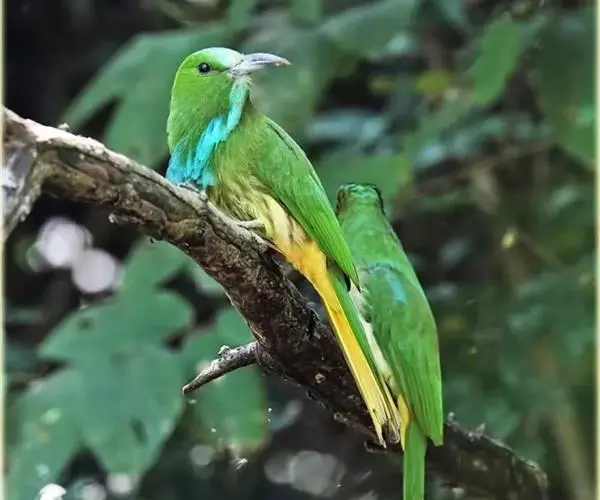 夏羽:上体自额至头顶前部辉淡蓝色,余部及头颈两侧、翅、尾表面草绿沾蓝色,外侧飞羽具黑褐色羽端及黄色内缘,侧尾羽内翈具赭黄色的基部和黑褐色的先端。下体自颏至胸二侧与背同色;喉中央淡蓝色,前颈至上胸的中央(长形羽)转暗蓝色;自下胸以下赭黄色,除尾下覆羽外,各羽具绿褐色的中央条纹。