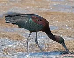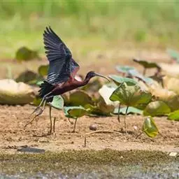 黑鹮(学名:Pseudibis papillosa):是鹳形目鹮科动物。体长600-680毫米,是一种大型涉禽。特征为头裸出,皮肤黑;体羽几乎全为深褐色,内侧小覆羽白,肩部具白色斑块,腿红色,颈背具浅蓝色斑块。通体体羽深褐,两翼及尾黑色具蓝色金属光泽,下体无栗色。 虹膜橙红色,嘴铅蓝黑色,脚和趾淡粉红色。
