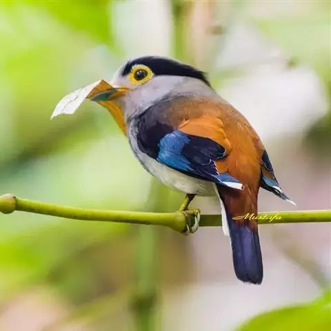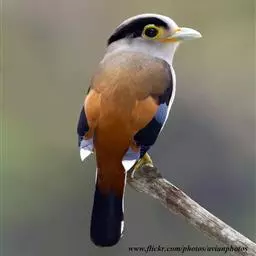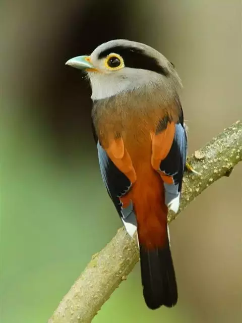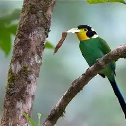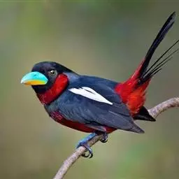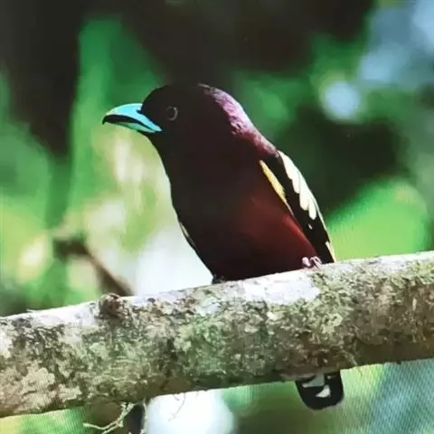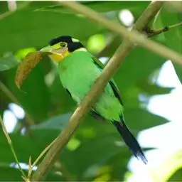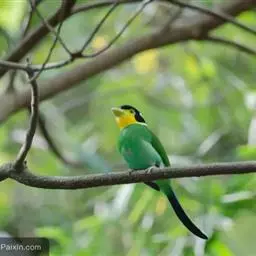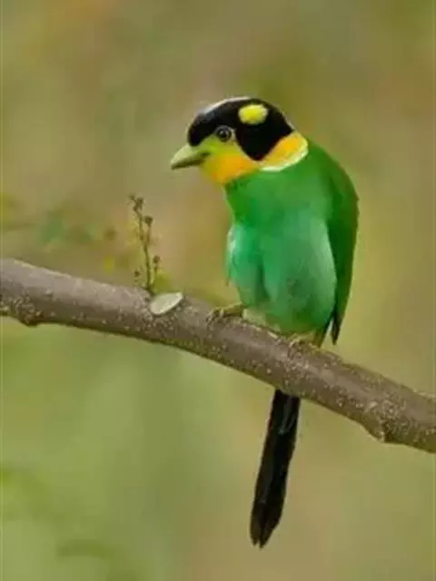 长尾阔嘴鸟是雀形目阔嘴鸟科的鸟类,体长约25厘米,是绿色阔嘴鸟。形长的楔形尾蓝色,喉及脸黄色,顶冠…