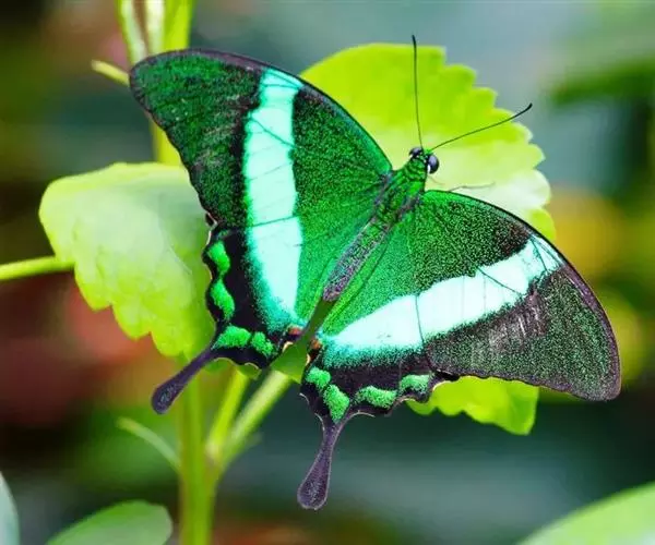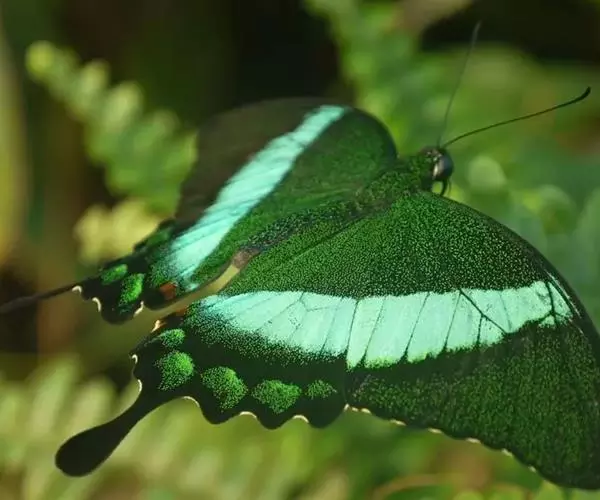 形态 成虫:翅展90—135 mm。体、翅黑色,满布翠绿色鳞片,在脉纹间更集中,已表现出翠绿带。雄蝶前翅在cu2—m3室有天鹅绒状的性标。后翅翠绿色鳞片有的均匀地散布,有的集中在基半部,有的集中在上角附近呈翠蓝色,有的集中在中后区的上半部。亚外缘有1列弯月形蓝色斑纹和红色斑纹;外缘波状;臀角有红色环形斑纹。翅反面前翅亚外缘区有灰黄或灰白色宽带,由后缘向前缘放射,越接近前缘越宽,颜色、越淡。后翅亚外缘区红色月牙形或钩形斑纹十分明显。其余与正面相似。