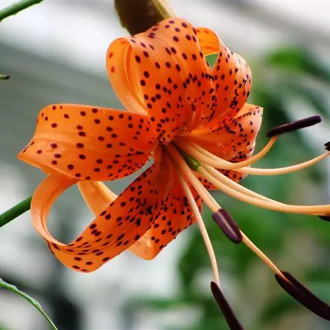 鳞茎白色,高4~7厘米,直径5~8厘来,宽卵形,深入土中约10厘米;茎直立,坚硬,基部埋在土内的部分具2~3轮纤维状根,地上部分高1.2~1.5米,直径 0.8~1.2厘米,有棱纹,深紫色,而被白色绵毛。叶散生,无柄,光亮,披针形,长3~15厘米,宽0.5~1.5厘米,先端渐尖,具显著叶脉5条以上,上部叶片逐渐变短以至形成叶状苞片,通常叶腋间生有珠芽;珠芽球形,直径2~3毫米,老时变为黑色。花序总状圆锥形;花梗粗硬,开展,花朵稍下垂;花被片6,桔红色,密生紫黑色斑点,开放时反卷,披针形,长8厘米,宽1.5厘米;雄蕊长5~7厘米,花药紫色,且具斑点;柱头紫色,子房长1.3~1.8厘米。果实倒卵形,长3~4厘米。花期一般在7月。