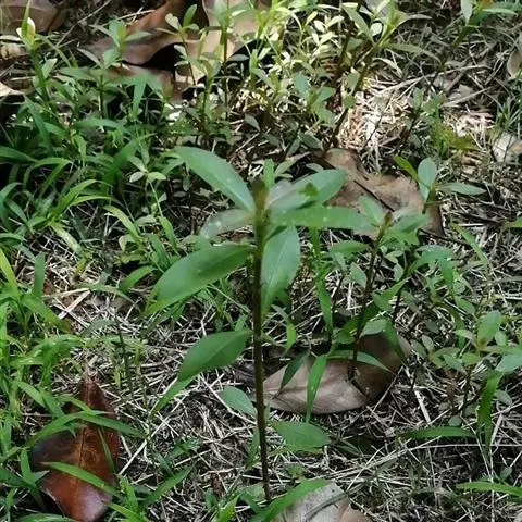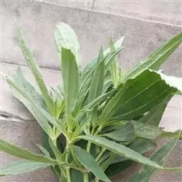 茎直立,圆柱形或有棱,具色条,无毛或稍有毛,有多数分枝。叶条形至狭披针形,长达7厘米,宽约1厘米,全缘,先端渐尖,基部收缩成短柄,中脉黄白色。