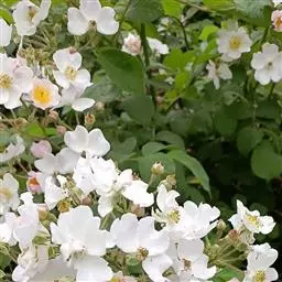光叶蔷薇(学名:Rosa wichurana Crep.)是攀援灌木,高3-5米,枝条平卧,节上易生根;小枝红褐色,皮刺小,常带紫红色,小叶5-7,叶片椭圆形、卵形或倒卵形,花多朵成伞房花序;苞片卵形,萼片披针形或卵状披针形,花瓣白色,有香味,倒卵形,果实球形或近球形,紫黑褐色,有光泽,花期4-7月,果期10-11月。