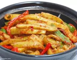 8. 倒入炸好的茄条翻炒,让茄条均匀裹上酱料;