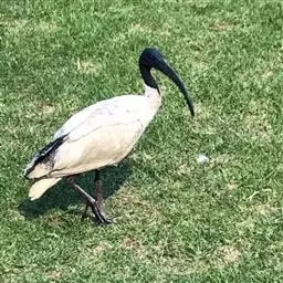 圣鹮(学名:Threskiornis aethiopicus)头、颈黑色,身体白色,初级和次级飞羽尖端黑色。喙长且厚、黑色下弯,跗蹠与趾黑色。下背部有大量黑色纱状装饰羽,翼下裸露皮肤红色,体侧有时带黄褐色。亚成鸟的头、颈有羽毛,斑驳黑色带有白色纵纹,三级飞羽棕黑色。