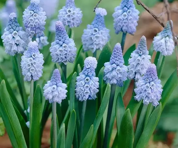 多年生草本。叶基生,线形,稍肉质,暗绿色,边缘常内卷,长约20cm。株高15~30cm,地下为鳞茎,外被白色皮膜,球径1~3cm,高约1.5cm。花期3~5月。花茎自叶丛中抽出,圆筒形,长约15cm,上面密生许多串铃的小花,花梗下垂,花有青紫、淡蓝、白色等。小花多数密生而下垂,花冠小坛状顶端紧缩,花蓝色或顶端白色,并有白色、肉色、淡蓝色和重瓣品种。