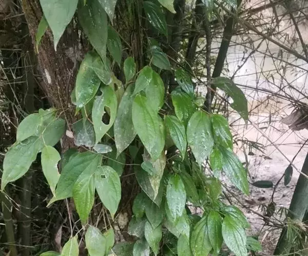 攀援藤本,长数至10余米,除花序轴和苞片柄外,余均无毛;茎、枝具细纵纹,节上生根。叶纸质或近革质,卵状披针形或椭圆形,少有披针形,长6-12厘米,宽2.5-4.5厘米,顶端短尖或渐尖,基部渐狭或楔形,有时钝,通常相等或有时略不等;叶脉5-7条,最上1对互生,离基1-3厘米从中脉发出,弯拱上升几达叶片顶部,如为7脉时,则最外1对细弱,网状脉通常明显;叶柄长5-12毫米;叶鞘长约为叶柄之半。