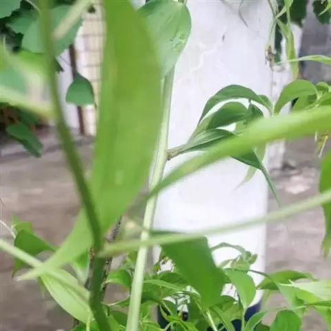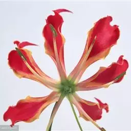 嘉兰 攀援植物;根状茎块状、肉质,常分叉,粗约1厘米。茎长2-3米或更长。叶通常互生,有时兼有对生的,披针形,长7-13厘米,先端尾状并延伸成很长的卷须(最下部的叶例外),基部有短柄。花美丽,单生于上部叶腋或叶腋附近,有时在枝的末端近伞房状排列;花梗长可达10-15厘米;花被片条状披针形,长4.5-5厘米,宽约8毫米,反折,由于花俯垂而向上举,基部收狭而多少呈柄状,边缘皱波状,上半部亮红色,下半部黄色,宿存;花丝长3-4厘米,花药条形,长约1厘米;花柱丝状,与花丝近等长,分裂部分长约6-7毫米。 [1-2]
