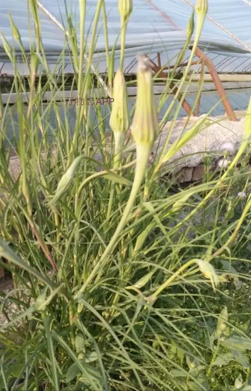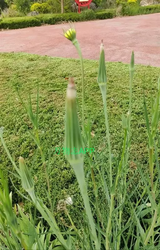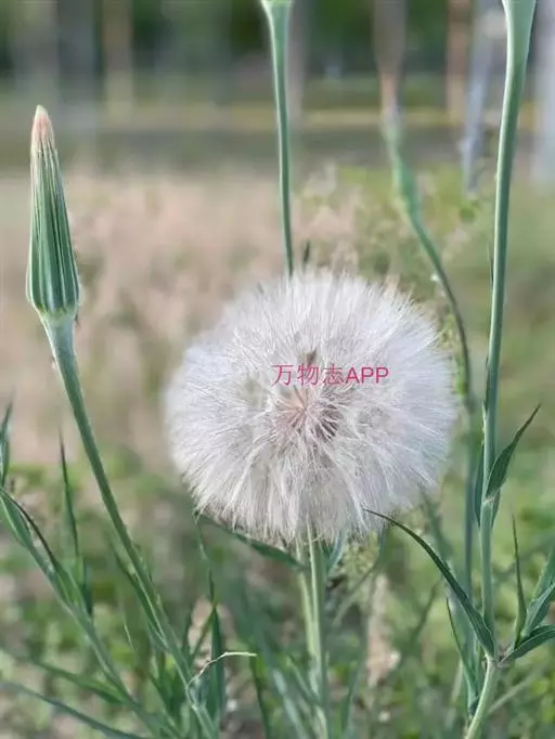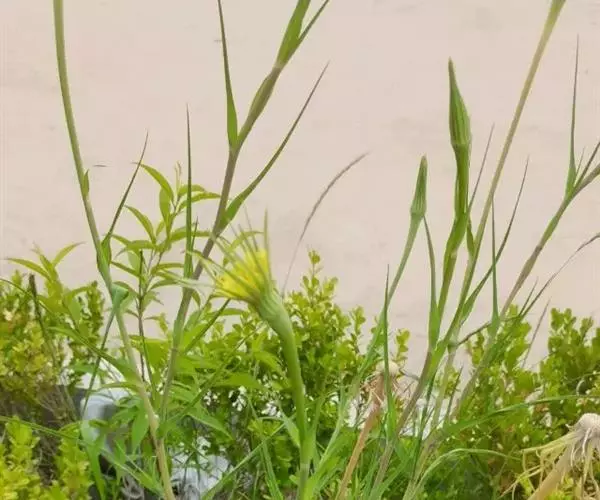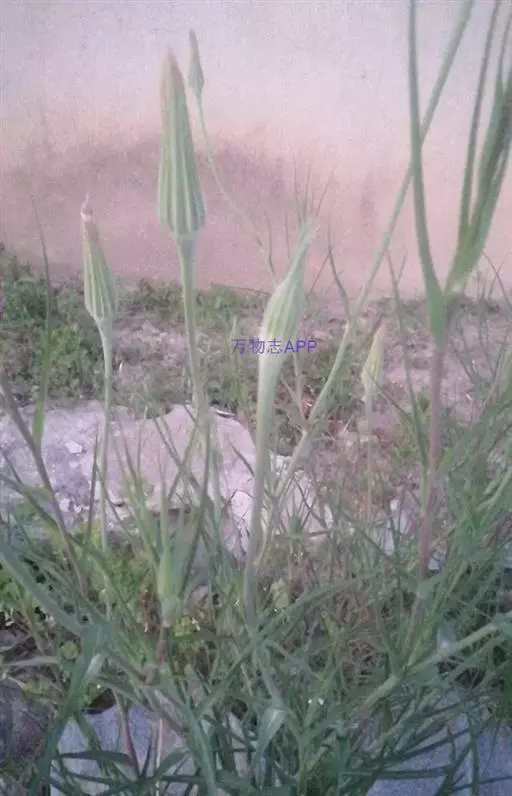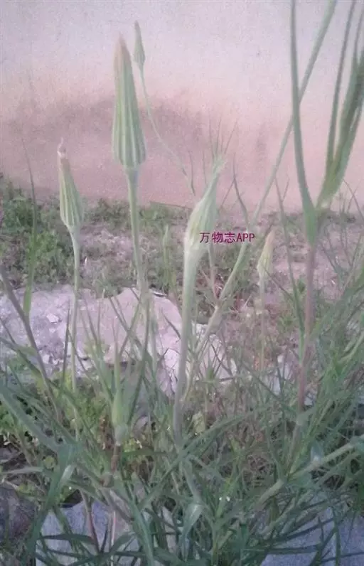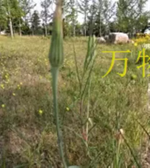 二年生草本,高30-60 (90)厘米。根圆柱状,垂直直伸,根颈被残存的基生叶柄。茎直立,不分枝或分枝,有纵条纹,无毛。基生叶及下部茎叶线形或线状披针形,长10-25(40)厘米,宽3-18(24)毫米,灰绿色,先端渐尖,全缘或皱波状,基部宽,半抱茎;中部及上部茎叶披针形或线形,长3-8厘米,宽3-10毫米。头状花序单生茎顶或植株含少数头状花序,生枝端。总苞圆柱状,长2-3厘米。总苞片8-10枚,披针形或线状披针形,长1.5-3.5厘米,宽5-10毫米,先端渐尖,边缘狭膜质,基部棕褐色。舌状小花黄色。瘦果长纺锤形,褐色,稍弯曲,长1.5-2厘米,有纵肋,沿肋有疣状突起,上部渐狭成细喙,喙长6-8毫米,顶端稍增粗,与冠毛连接处有蛛丝状毛环。冠毛淡黄色,长1-1.5厘米。花果期5-9月。