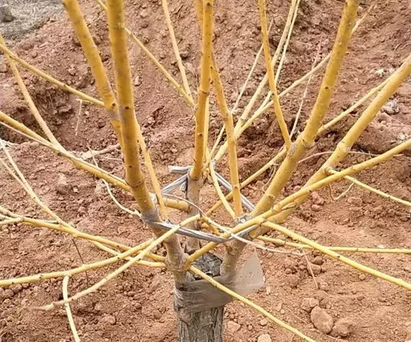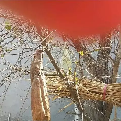 嫁接后一个月,成活的接穗即可发芽。同时砧木上的隐芽也会萌发,形成萌蘖,要及时将其去除,以免影响接穗生长。因接穗生长旺盛,要及时解绑,并将新梢绑缚在木棍上,以防其被风刮坏。