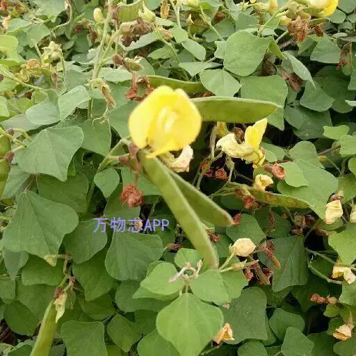 2、长柄野扁豆又名:水芽豆。多年生缠绕藤本,长1-4米。茎密被灰色短柔毛,具纵棱,棱上被毛较密。叶具羽状3小叶;托叶小,早落;叶柄长1.5-4厘米,密被短柔毛;顶生小叶菱形,长和宽约3-4厘米,先端急尖,基部钝、圆形或有时近截平,侧生小叶较小,斜卵形,两面均密被灰色短柔毛,下面有红色腺点;基出脉3,侧脉每边1-3条;小托叶常缺;小叶柄长1-2毫米,与叶柄同被灰色短柔毛。短总状花序腋生;有花1-2朵,稀3-4朵;花长1.5-2厘米;总花梗长0.5-1厘米;花梗长2-6毫米,均密被灰色短柔毛;花萼钟状,萼齿卵状披针形,被短柔毛及有橙黄色腺点;花冠黄色,旗瓣横椭圆形,宽大于长,基部有2耳,冀瓣窄椭圆形,基部一侧具下弯的耳,龙骨瓣极弯曲,具长喙,无耳;雄蕊二体;子房密被丝质柔毛及橙黄色腺点,具柄,有胚珠9-11颗。荚果线状长圆形,长5-8厘米,宽0.9-1.1厘米,密被灰色短柔毛和橙黄色细小腺点,先端具长喙;果颈长1.5-1.7厘米;种子7-11颗,近圆形,扁平,黑色,长宽约4毫米。花、果期6-11月。
