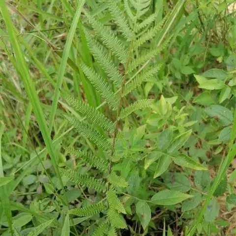 中型陆生植物 ,植株高30-60厘米。根状茎短而直立,连同叶柄基部被红棕色、具长缘毛的狭披针形鳞片。叶簇生;叶柄长10-25厘米,粗2-3毫米,淡禾秆色;叶片长20-50厘米,中部宽5-12厘米,披针形,先端渐尖并羽裂,向基部渐变狭,二回羽裂,或一回羽状而边缘具粗齿;羽片20-30对,互生,斜展,中部的最大,长2.5-6厘米,宽约1厘米,狭披针形,先端渐尖,基部阔而下延,在羽片间彼此以圆耳状或三角形的翅相连,羽裂达1/3-1/2;裂片斜展,卵状三角形,钝头,全缘,向两端的羽片逐渐缩短,基部一对羽片常缩小成耳片;叶脉羽状,侧脉单一,伸达叶边。叶草质,沿叶轴、羽轴和叶脉两面被灰白色的单细胞针状短毛,下面并混生顶端分叉或呈星状的毛,在叶轴和羽轴下面还疏生淡棕色、毛状的或披针形而具缘毛的鳞片。孢子囊群近圆形,背生于侧脉的近顶端,每裂片2-3对,幼时中央有成束的、具柄的分叉毛,无盖;孢子囊体顶部近环带处有时有一、二短刚毛或具柄的头状毛;孢子外壁光滑,周壁表面具颗粒状纹饰。