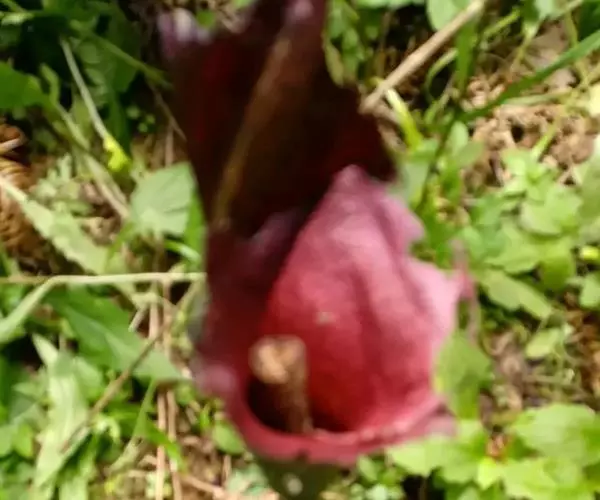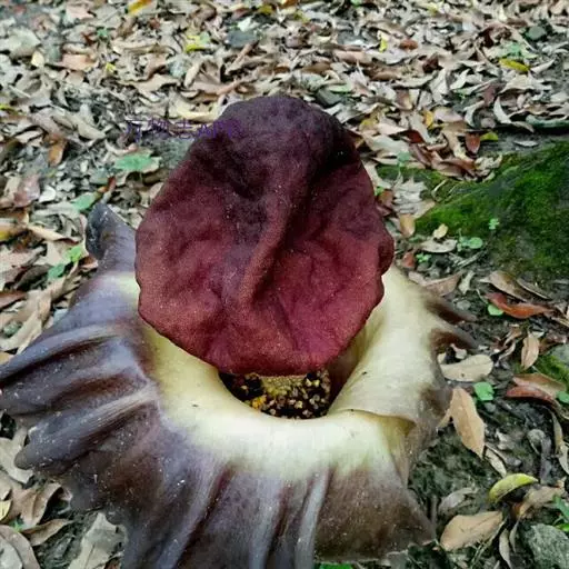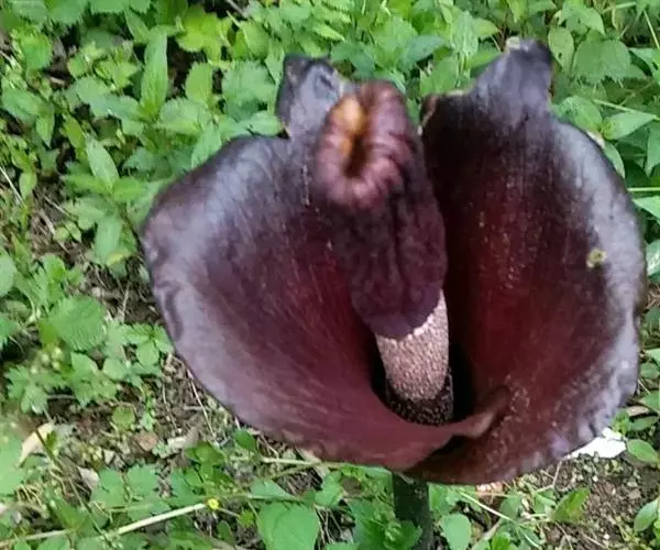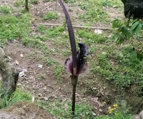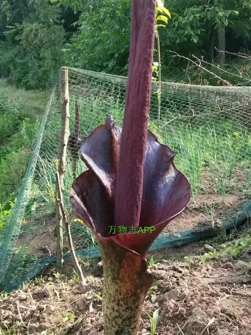花序柄长50-70厘米,粗1.5-2厘米,色泽同叶柄。佛焰苞漏斗形,长20-30厘米,基部席卷,管部长6-8厘米,宽3-4厘米,苍绿色,杂以暗绿色斑块,边缘紫红色;檐部长15-20厘米,宽约15厘米,心状圆形,锐尖,边缘折波状,外面变绿色,内面深紫色。肉穗花序比佛焰苞长1倍,雌花序圆柱形,长约6厘米,粗3厘米,紫色;雄花序紧接(有时杂以少数两性花),长8厘米,粗2-2.3厘米;附属器伸长的圆锥形,长20-25厘米,中空,明显具小薄片或具棱状长圆形的不育花遗垫,深紫色。花丝长1毫米,宽2毫米,花药长2毫米。子房长约2毫米,苍绿色或紫红色,2室,胚珠极短,无柄,花柱与子房近等长,柱头边缘3裂。浆果球形或扁球形,成熟时黄绿色。花期4-6月,果8-9月成熟。