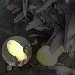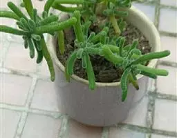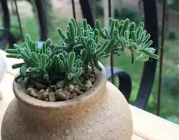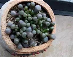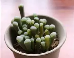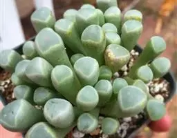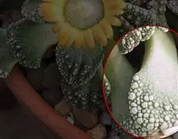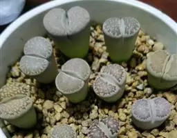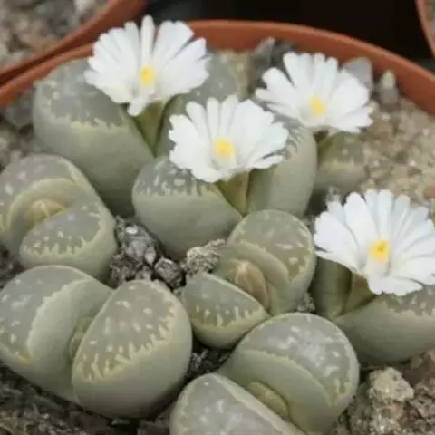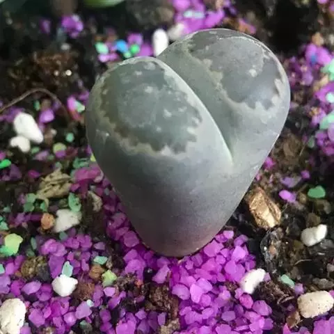 荒玉为番杏科生石花属,原产南非。株体呈白粉色,表面布满凹凸纹路,凹陷处为红褐色,每年秋季开黄花。