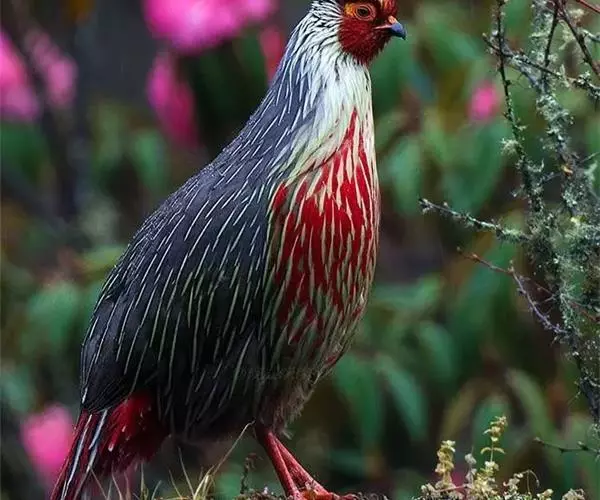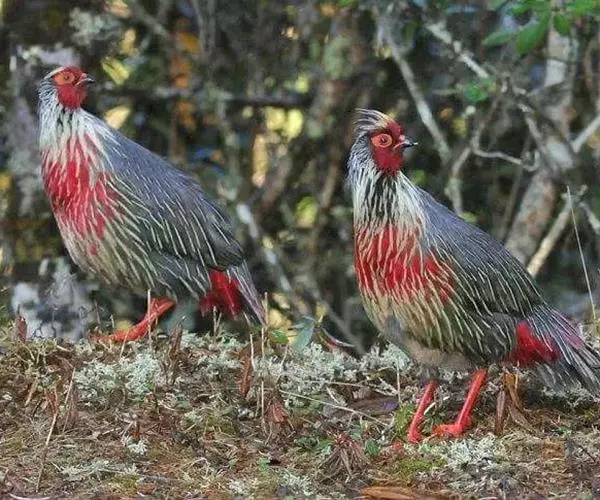血雉(学名:Ithaginis cruentus),别名血鸡、松花鸡,血雉的雄鸟大覆羽、尾下覆羽、尾上覆羽、脚、头侧、腊膜为红色,故称血雉。其别名甚多,各地皆异。在甘肃,因其胸侧和翅上覆羽沾绿,被称为“绿鸡”;因其羽毛形似柳叶,且沾绿,又称为“柳鸡”;因其主要栖于松林和云杉林,食松(杉)叶和种子,又称为“松鸡子”;又因其脚红色,称“红脚鸡”者最为普遍。主要分布于中国,为国家二级保护动物,西部和西南部留鸟。
