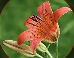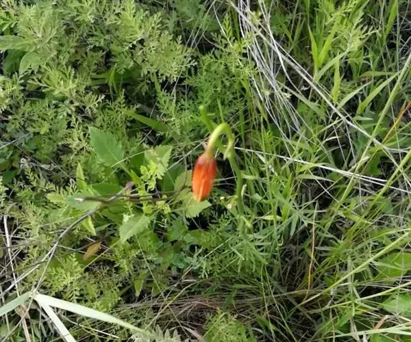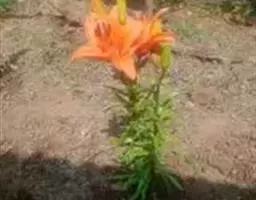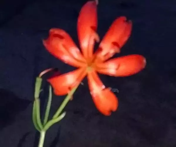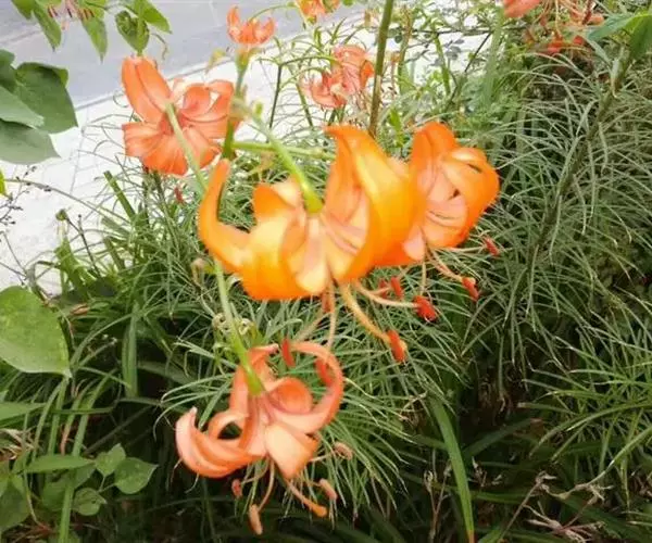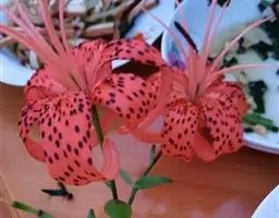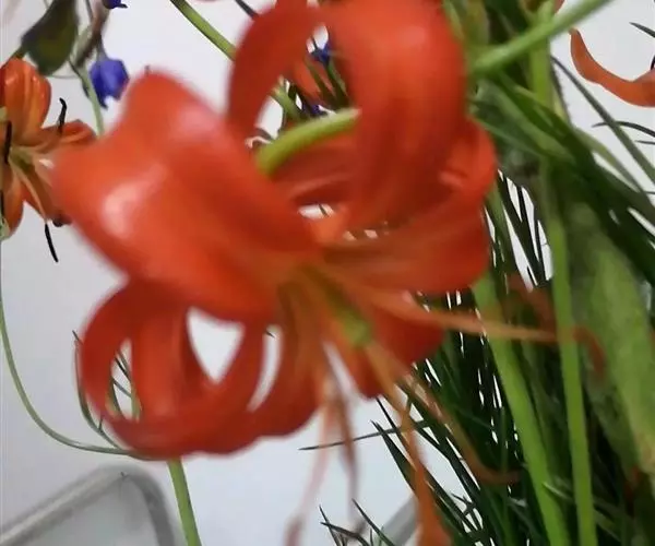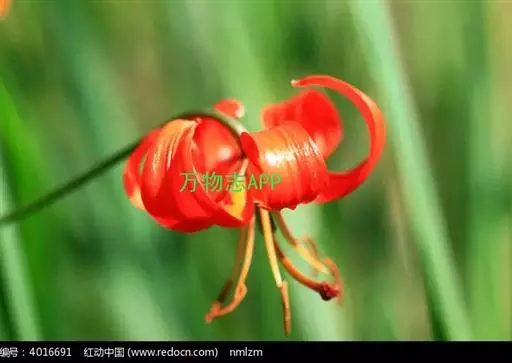山丹百合 鳞茎卵形或圆锥形,高2.5-4.5厘米,直径2-3厘米;鳞片矩圆形或长卵形,长2-3.5厘米, 宽1-1.5厘米,白色。茎高15-60厘米,有小乳头状突起,有的带紫色条纹。叶散生于茎中部,条形,长3.5-9厘米,宽1.5-3毫米,中脉下面突出,边缘有乳头状突起。花单生或数朵排成总状花序,鲜红色,通常无斑点,有时有少数. 斑点,下垂;花被片反卷,长4-4.5厘米,宽0.8-1.1厘米,蜜腺两边有乳头状突起;花丝长1.2-2.5厘米,无毛,花药长椭圆形,长约1厘米,黄色,花粉近红色;子房圆柱形,长0.8-1厘米;花柱稍长于子房或长1倍多,长1.2-1.6厘米,柱头膨大,径5毫米,3裂。蒴果矩圆形,长2厘米,宽1.2-1.8厘米。花期7-8月,果期9-10月。