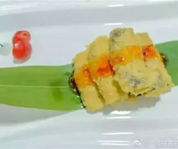3. 豆腐皮(油皮)用湿布抹透至软,将馅料放入,卷成长条形,在收口处涂上粉浆待用。