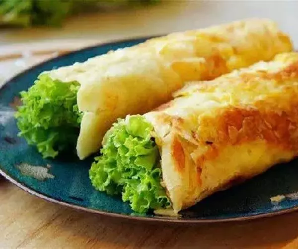 4. 烧热炒锅,下油约1/4杯,放入素菜卷煎至两面金黄色,盛出,斜切大段便可供食。