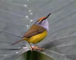 • 金头伪缝叶莺:体长10-12厘米,是一种体型小的棕顶冠、黄色腹森林莺类。头顶亮黄色,具明显的黄色眉…