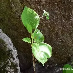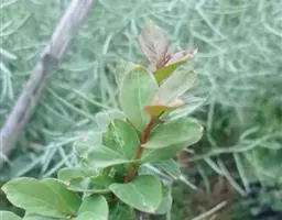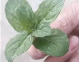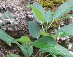 叶卵状披针形或菱伏披针形,有时卵形,长1.2-3.5厘米,宽0.5-1.8厘米,先端渐尖或急尖,基部渐狭,边缘具锐尖的疏齿,近基部全缘,纸质,上面榄绿色,无毛或近无毛,下面灰白色,无毛,散布凹陷腺点;叶柄长3-18毫米,腹凹背凸,腹面被微柔毛。