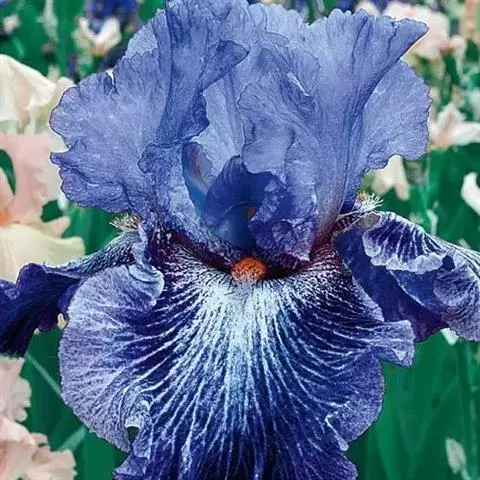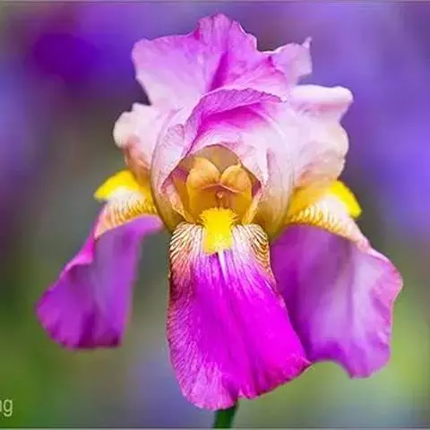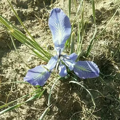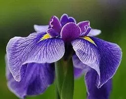 花茎实心,光滑,高40-60厘米,有不明显的纵棱,中、下部有2-3枚茎生叶;苞片3-5枚,膜质,披针形,长6-9厘米,宽1-1.5厘米,顶端渐尖或短渐尖,中脉明显,内包含有2-4朵花;花大,蓝紫色,直径9-10厘米;花梗长1.5-3.5厘米;花被管上部稍膨大,似喇叭形,长约2厘米,直径5-7毫米;外花被裂片倒卵形或椭圆形,长7.5-9厘米,宽4-4.5厘米,上部反折下垂,爪部楔形,中央下陷呈沟状,鲜黄色,无附属物,内花被裂片直立,倒披针形,长5-6.5厘米,宽4.8-1.5厘米;雄蕊长约3厘米,花药白色;花柱分枝扁平,花瓣状,拱形弯曲,长5-6厘米,宽约1.2厘米,顶端裂片半圆形,长1.5-2厘米,边缘有波状的牙齿,子房钝三角状圆柱形,上部略膨大,长2-2.2厘米,直径约6毫米。
