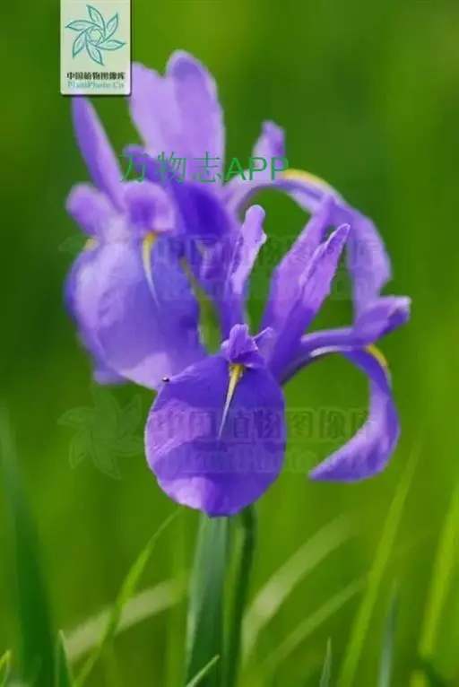 燕子花(学名:Iris laevigata Fisch. ex Fisch. & C. A. Mey.):多年生草本,植株基部围有棕褐色毛发状的老叶残留纤维。根状茎粗壮,斜伸,棕褐色;须根黄白色,有皱缩的横纹。叶灰绿色,剑形或宽条形。花茎实心,光滑,有2-3枚茎生叶;苞片3-5枚,内包含有2-4朵花;花大,蓝紫色,直径9-10厘米;外花被裂片倒卵形或椭圆形,上部反折下垂,爪部楔形,内花被裂片直立,倒披针形,长5-6.5厘米,宽4.8-1.5厘米。蒴果椭圆状柱形,有6条纵肋;种子扁平,半圆形,褐色,有光泽。花期5-6月,果期7-8月。