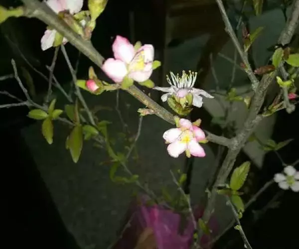 花1-2朵,先于叶开放,直径2-3厘米;花梗长4-8毫米;萼筒宽钟形,长3-5毫米,无毛或幼时微具毛;萼片卵形或卵状披针形,无毛,近先端疏生小锯齿;花瓣近圆形或宽倒卵形,长6-10毫米,先端圆钝,有时微凹,粉红色;雄蕊约25-30,短于花瓣;子房密被短柔毛,花柱稍长于雄蕊。