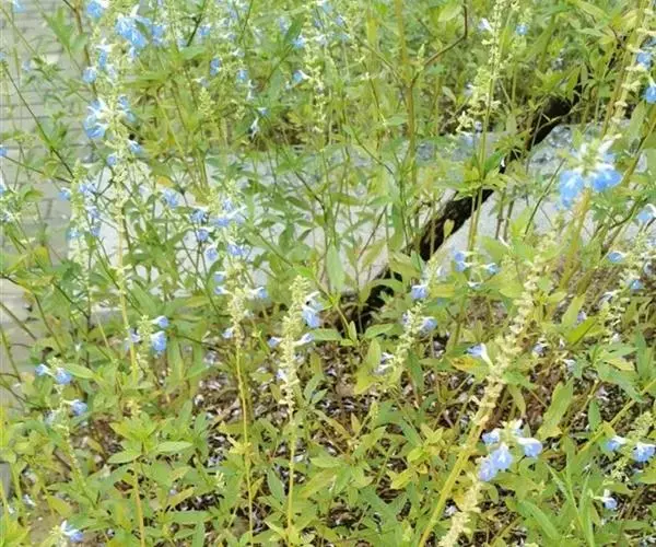 天蓝鼠尾草(Saiviaofficinalis)又名洋苏叶,为唇形科多年生植物,根系发达,地上部分丛生,茎近于木质,较矮,叶对生,灰银色,椭圆形有锯齿,叶柄较长,上密布白色绒毛,触感犹如天鹅绒,基部叶片近叶柄较窄,茎上叶片长,较尖。花6-10朵成串轮生于茎顶花序上十分美丽。种子近园形,千粒重4克,发芽力3年以上。成株高80厘米,盆栽30-50厘米,开蓝紫色至粉紫色花,有香味,叶有浓郁的香味。花可用来泡茶,散发清香味可清净体内油脂,帮助循环,能发挥养颜美容之功效。