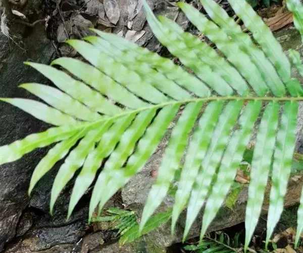 叶脉上面明显,主脉两面均隆起,上面有纵沟,小脉分离,单一或二叉,斜展或近平展,平行,密接。叶近革质,干后棕色,无毛;叶轴粗壮,棕禾秆色,无毛。孢子囊群线形,连续,紧靠主脉两侧,与主脉平行,仅线形或线状披针形的羽片能育(通常羽片上部不育);囊群盖线形,开向主脉,宿存。染色体2n=66。
