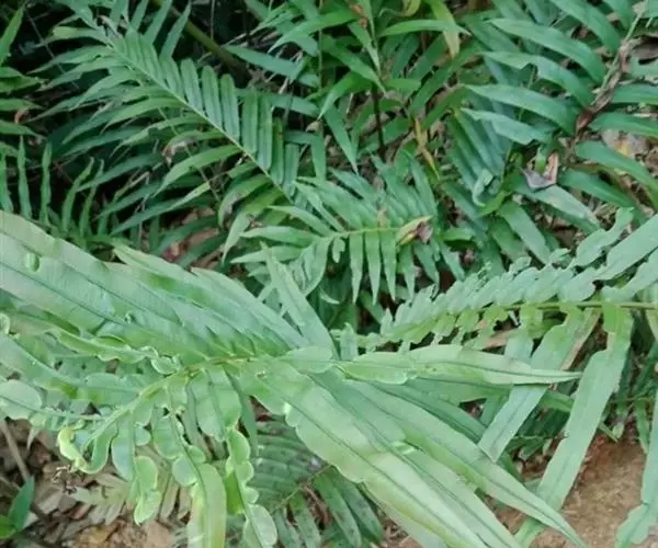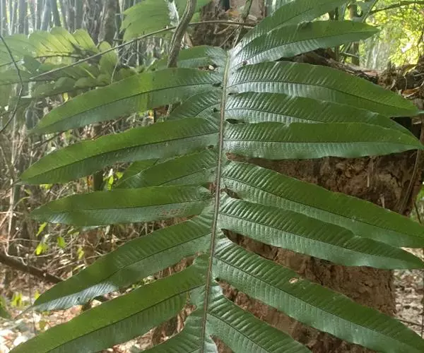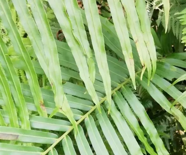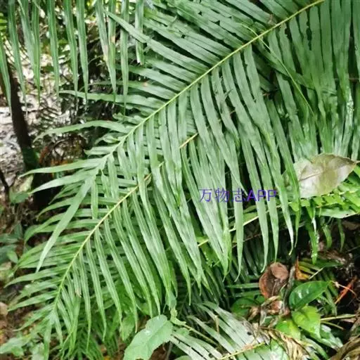 叶簇生于根状茎顶端;柄长3-80厘米,粗3-10毫米,坚硬,基部往往为黑褐色,向上为棕禾秆色或棕绿色,无毛;叶片卵状披针形,长达1米左右,宽20-60厘米,一回羽状;羽片多数,二形,互生,无柄,下部羽片不育,极度缩小为圆耳形,长仅数毫米,彼此远离,向上羽片突然伸长,疏离,能育,至中上部羽片最长,斜展,线形或线状披针形,长10-30厘米,宽5-18毫米,先端长渐尖或尾状渐尖,基部圆楔形,下侧往往与叶轴合生,全缘或呈微波状,干后反卷,上部羽片向上逐渐缩短,基部与叶轴合生并沿叶轴下延,顶生羽片与其下的侧生羽片同形,但长于其下的侧生羽片。