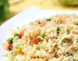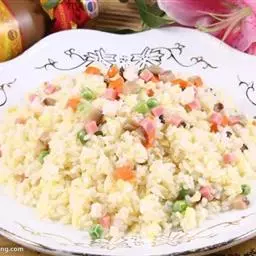 2.将锅放在大火上,内加入猪油烧制五成熟,放入葱花、姜爆香,然后将辅料中的鸡丁、瘦猪肉、虾仁、熟火腿丁、香菇丁分别到入锅中炒熟。出锅后放凉备用;