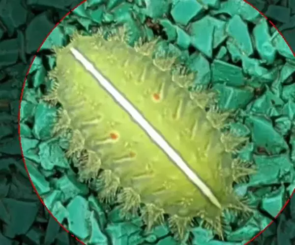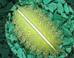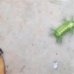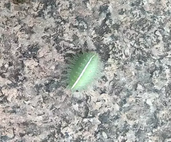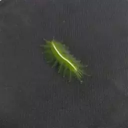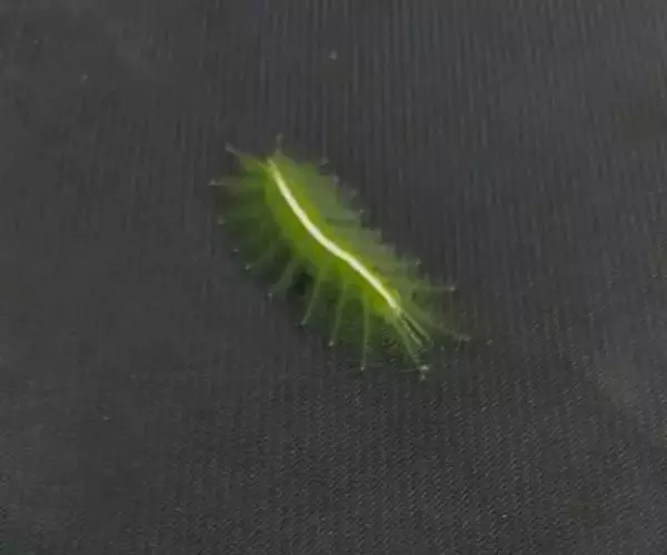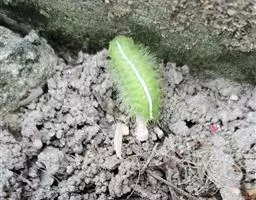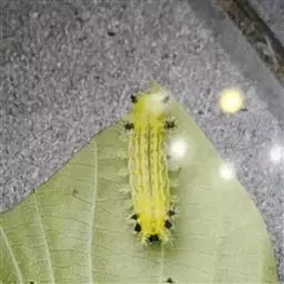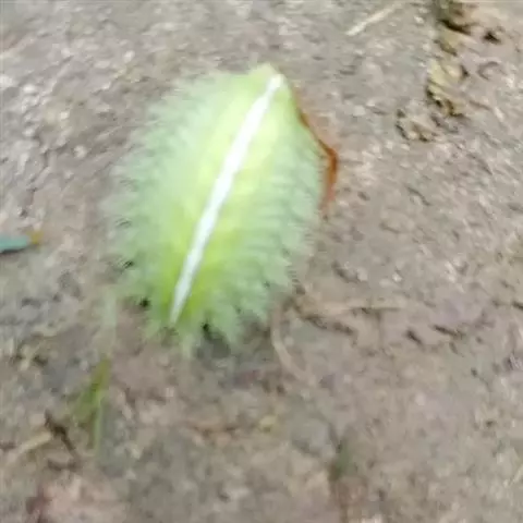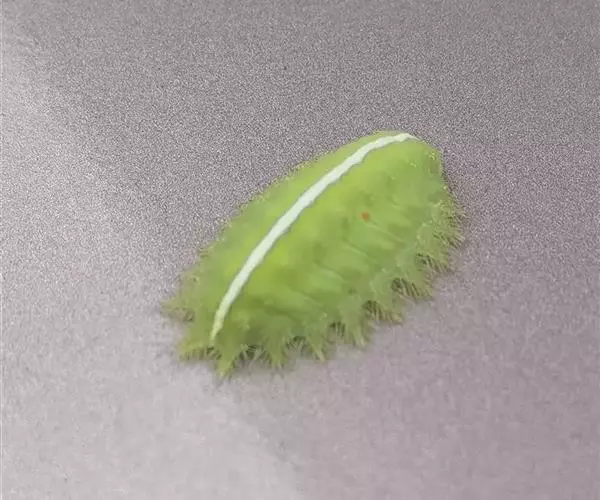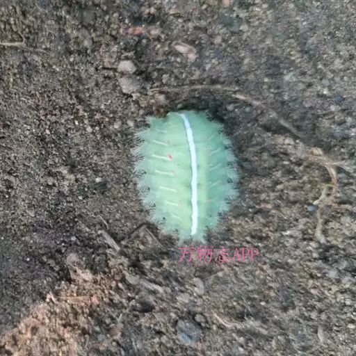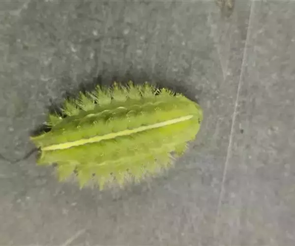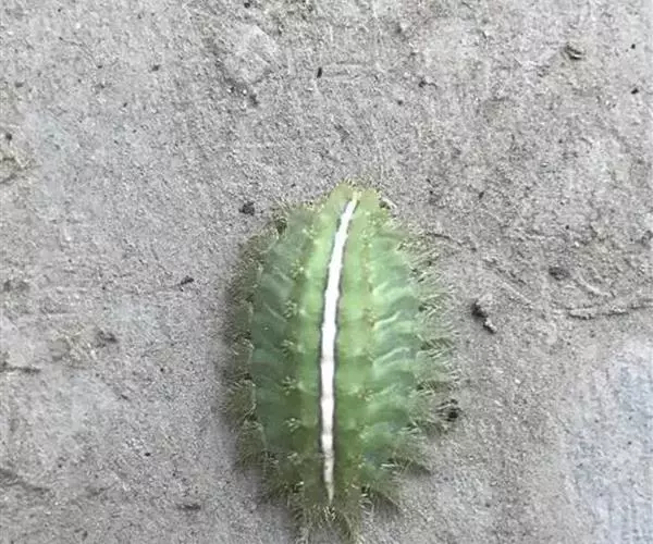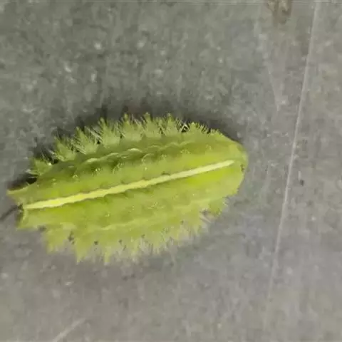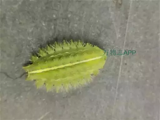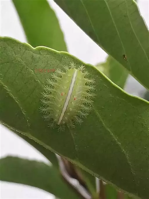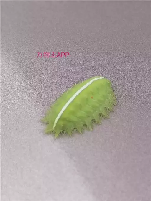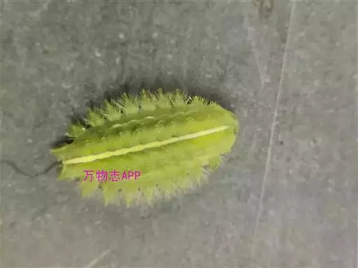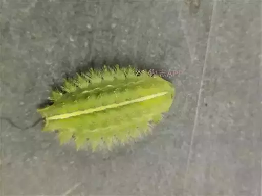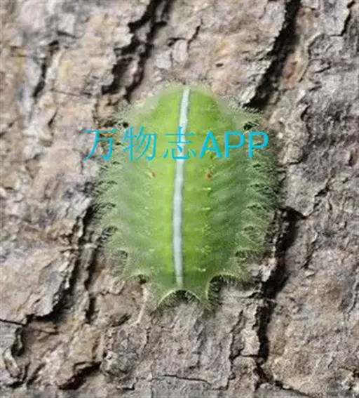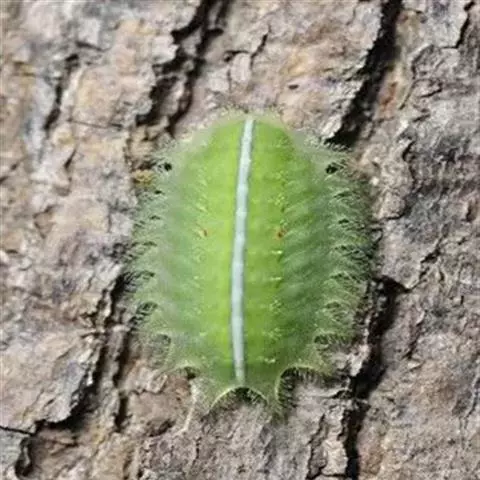 老熟幼虫体长21--26毫米,宽16毫米,体扁、椭圆形,背部稍隆起,形似龟背。全体绿色或黄绿色,背线白色。体两侧各有10个瘤状突起,其上生有刺毛,每一体节的背面有2小丛刺毛,第四节背面两侧各有一红点。