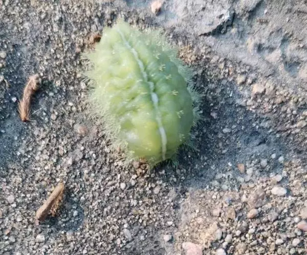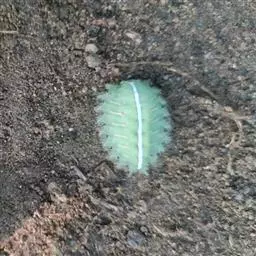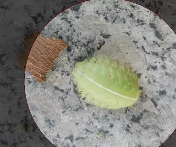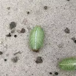 长10-15毫米,前端肥钝,后端略尖削,近似椭圆形。初为乳白色,近羽化时变为黄褐色。