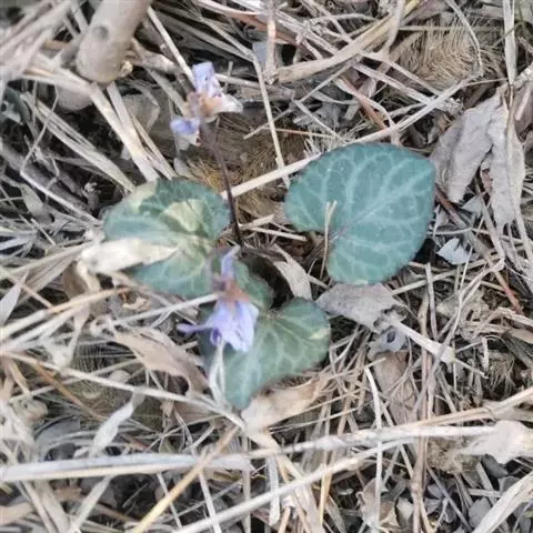 花较小,淡紫色或浅黄色,具长梗,生于基生叶或匍匐枝叶丛的叶腋间;花梗纤细,长1.5-8.5cm,无毛或被疏柔毛,中部有1对线形苞片;萼片披针形,长4-5.5mm,先端尖,基部附属物短,末端圆或具稀疏细齿,边缘疏生睫毛;侧方花瓣倒卵形或长圆状倒卵形,长6-8mm,无须毛,下方花瓣连距长约6mm,较其他花瓣显著短;距极短,长仅1.5mm,稍露出萼片附属物之外;下方2枚雄蕊背部的距短而宽,呈三角形;子房无毛,花柱棍棒状,基部稍膝曲,上部渐增粗,柱头两侧及后方具肥厚的缘边,中央部分稍隆起,前方具短喙。
