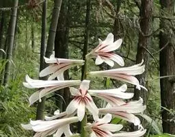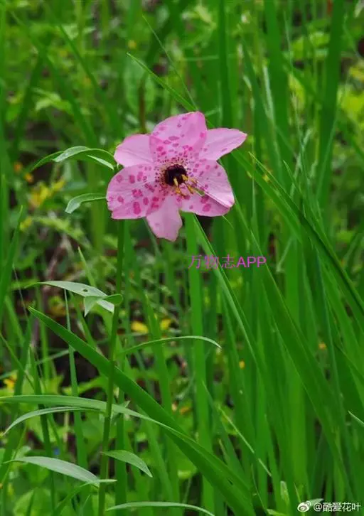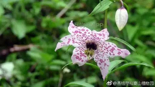 百合科,豹子花属;鳞茎卵形,高达4厘米,粗达4厘米;鳞片白色,8—18枚,披针形,长达3.5厘米,宽达2厘米,有时小得多,肥厚,腹面内凹,背面隆起成高丘状。茎高30—70厘米,绿色,具棱线(由叶柄两侧基部下延而成),光滑,无毛。叶散生,上部的常对生,狭椭圆形、线状披针形,上面绿色,背面淡绿色,长2.5—3.2(—5.5)厘米,宽6—8(—12)毫米,先端急尖,基部略狭,无柄,无毛,但叶腋两侧有簇生的绒毛。花1—5朵,单生叶腋;花梗绿色,长达1.4厘米,下弯,无毛。花下垂,白色,淡黄色。内面近基部有三两紫色的小斑点,花被片张开成覆盆状,外轮花被片卵形,先端急尖或浑圆具小尖头,长2.2—2.5厘米,宽1.2—1.5厘米,背面中肋呈线状隆起,基部散布4—6个紫色小斑点;内轮花被片卵状长圆形,长2.5厘米,宽达1.8厘米,先端钝圆,基部圆形具1—2个紫点,最下部为暗紫色,全缘。雄蕊6,直立,围绕着雌蕊,低于柱头,花丝绿色,长9毫米,无毛;花药紫色,长4毫米;子房圆柱形,绿色,长6毫米,有纵槽,花柱淡绿色,长9毫米,柱头乳白色,三角星状;子房3室,每室有胚珠9—10枚,叠生于中轴胎座上。果为蒴果,淡褐色,长圆形,长1厘米,宽1.5厘米,从顶部开始室间开裂。 花期6—7月,果期10—11月。