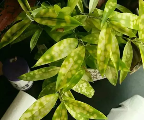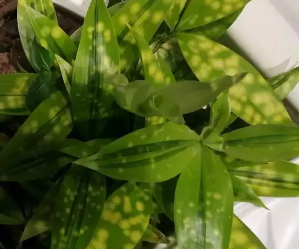单叶对生或三叶轮生,长椭圆形,浓绿色或橄榄色,叶面上布满乳白色或黄色的小斑点。花黄绿色,花期5月。