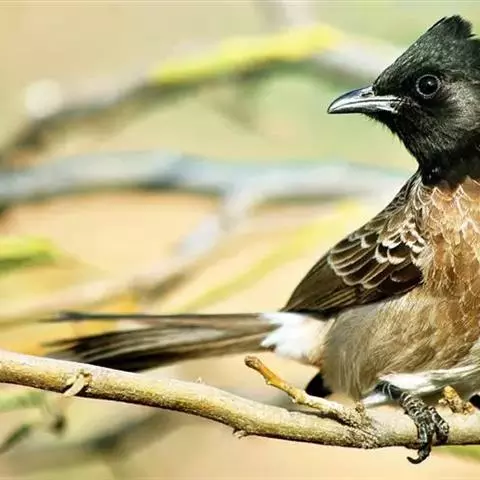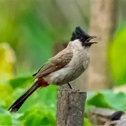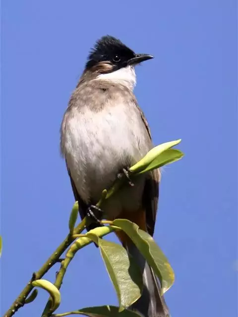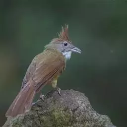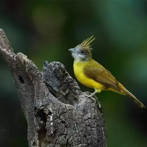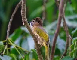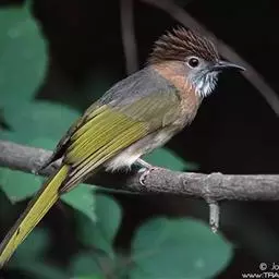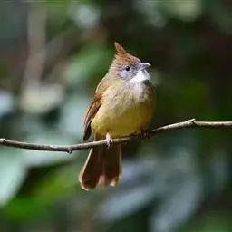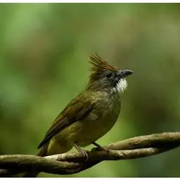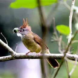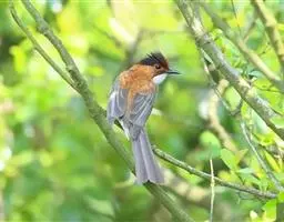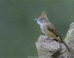 白喉冠鹎:体长20-25厘米。头顶红褐色,有长而细的羽冠、红褐色,头侧灰色。上体橄榄绿黄色,…