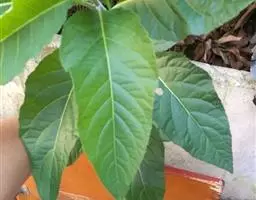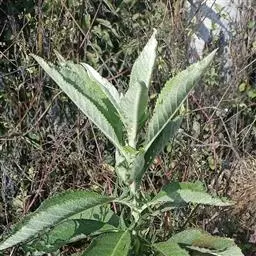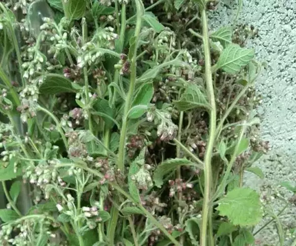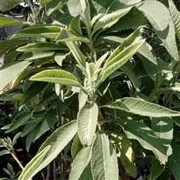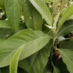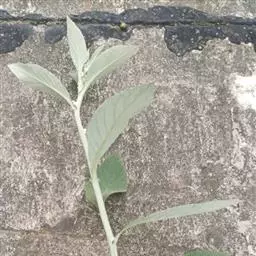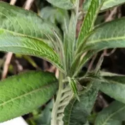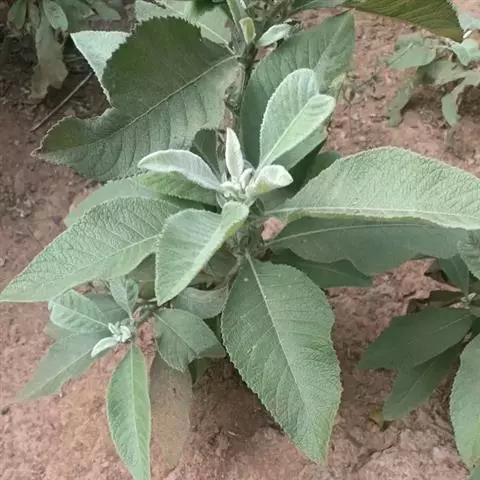 叶:下部叶有长达1-2厘米的柄,叶片倒卵形,长7-9厘米,宽3-4厘米,基部楔状渐狭,顶端圆钝,边缘有不规则的密细齿,两面被绢状长柔毛,在下面通常较密,中脉在下面明显凸起,侧脉5-7对,弧状或斜上升,不抵边缘,网脉明显或仅在下面明显;中部叶具短柄,倒卵形至倒卵状长圆形,长3-5厘米,宽2.5-3厘米,基部楔尖,顶端钝或短尖,有时具小尖头;上部叶渐小,近无柄,长1-2厘米,宽0.3-0.8厘米。