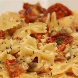 6. 加入做法2的酱汁于做法5的面中,再依序加入鲜奶油、辣椒粉、胡椒盐、起司粉拌匀即可装盘,放上做法3的鸡胸肉,最后淋少许做法4的青酱及少许松子即可。