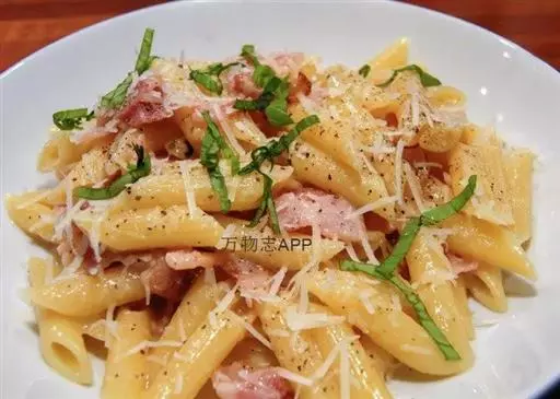 A.意大利面100~120克、培根40克、洋菇40克、洋葱10克、青豆仁少许、黑胡椒少许、奶油20克、盐少许、鸡高汤少许。