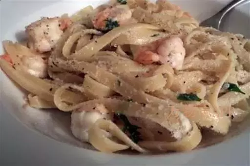 【制作】:1.虾仁挑去泥肠,洗净沥干水分。 2.洋葱切成片。 3.意面煮熟备用。 4.炒锅中加入适量橄榄油,姜片、洋葱、虾仁炒香、炒熟,加入白酒制成汁,放入意面,再加入香草汁,烩好即可。