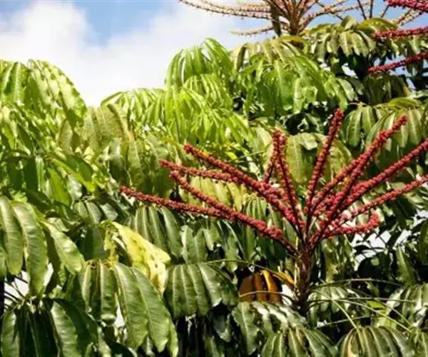 昆士兰伞木,吕松鹅掌柴 ,称昆石兰遮树,澳洲鸭脚木、方式叶鹅掌柴、伞树、大叶伞。叶片阔大,柔软下垂,形似伞状,株形优雅轻盈,易于管理,适于客厅的墙隅与沙发旁边置放,是室内理想的观叶植物。但目前多由南方引进,成本较高。常绿乔木,高可达30~40米。茎杆直立,少分枝,嫩枝绿色,后呈褐色,平滑。叶为掌状复叶,小叶数随树木的年龄而异,幼年时3~5片,长大时5~7片,至乔木状时可多达16片。小叶片椭圆形,先端钝,有短突尖,叶缘波状,革质,长20~30厘米,宽10厘米,浓绿色叶子。有光泽,叶背淡绿色。叶柄红褐色,长5~10厘米。浆果,圆球形,熟时紫红色。